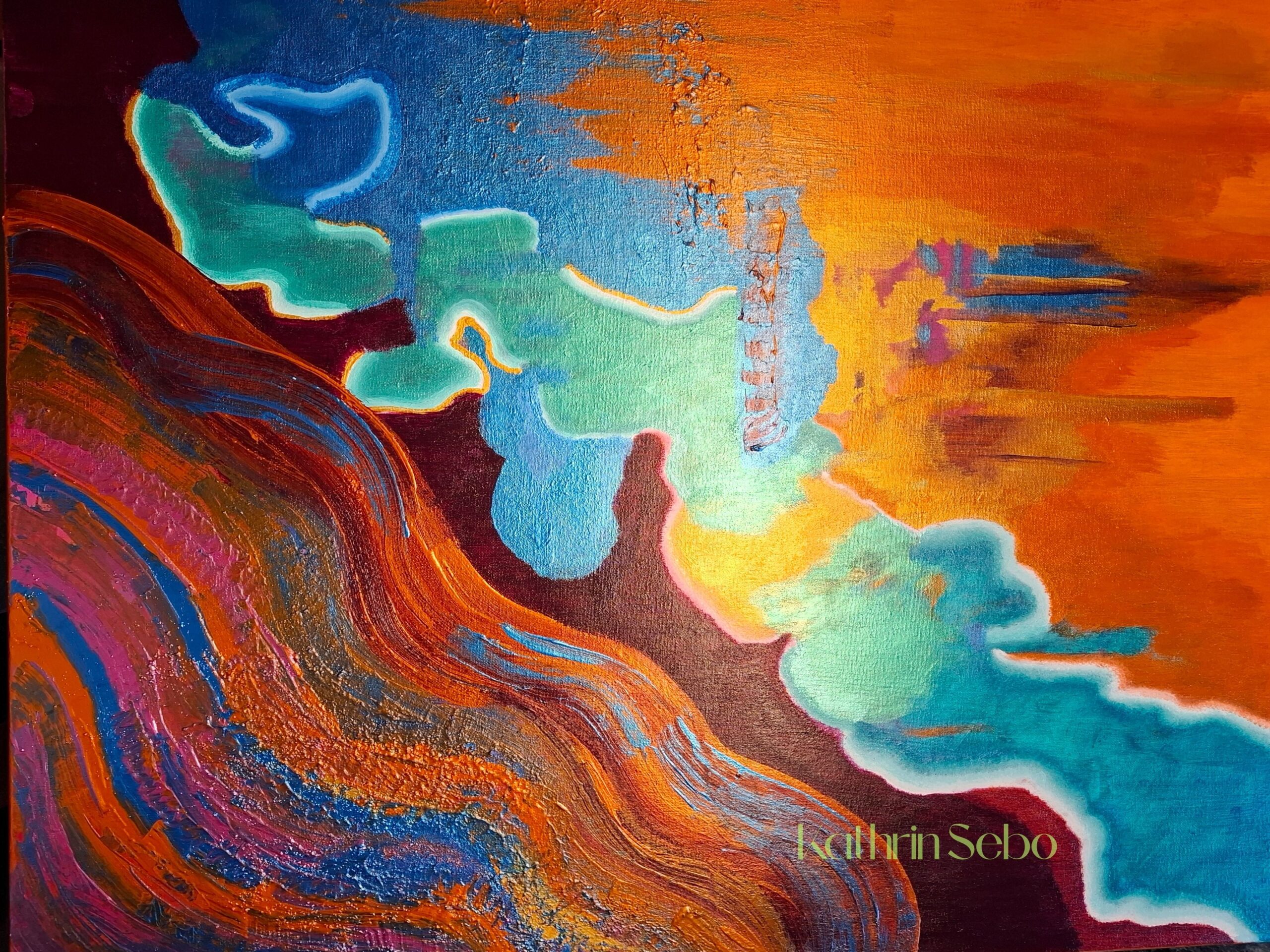 Beim Malen tauche ich ein in diese Energien, sei es der Mut, das Annehmen-was-ist oder der ganz eigene Ausdruck. Ganz aus dem Moment, intuitiv beginnen dann Formen und Farbe auf die Leinwand zu fließen.